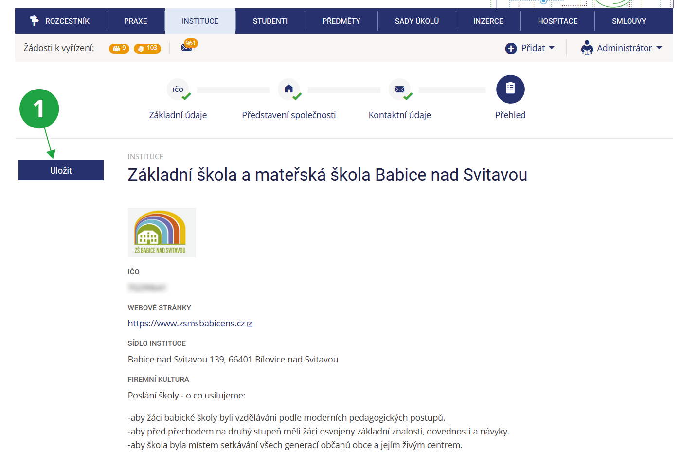 1 Náhled připraveného profilu instituce před fináním uložením.