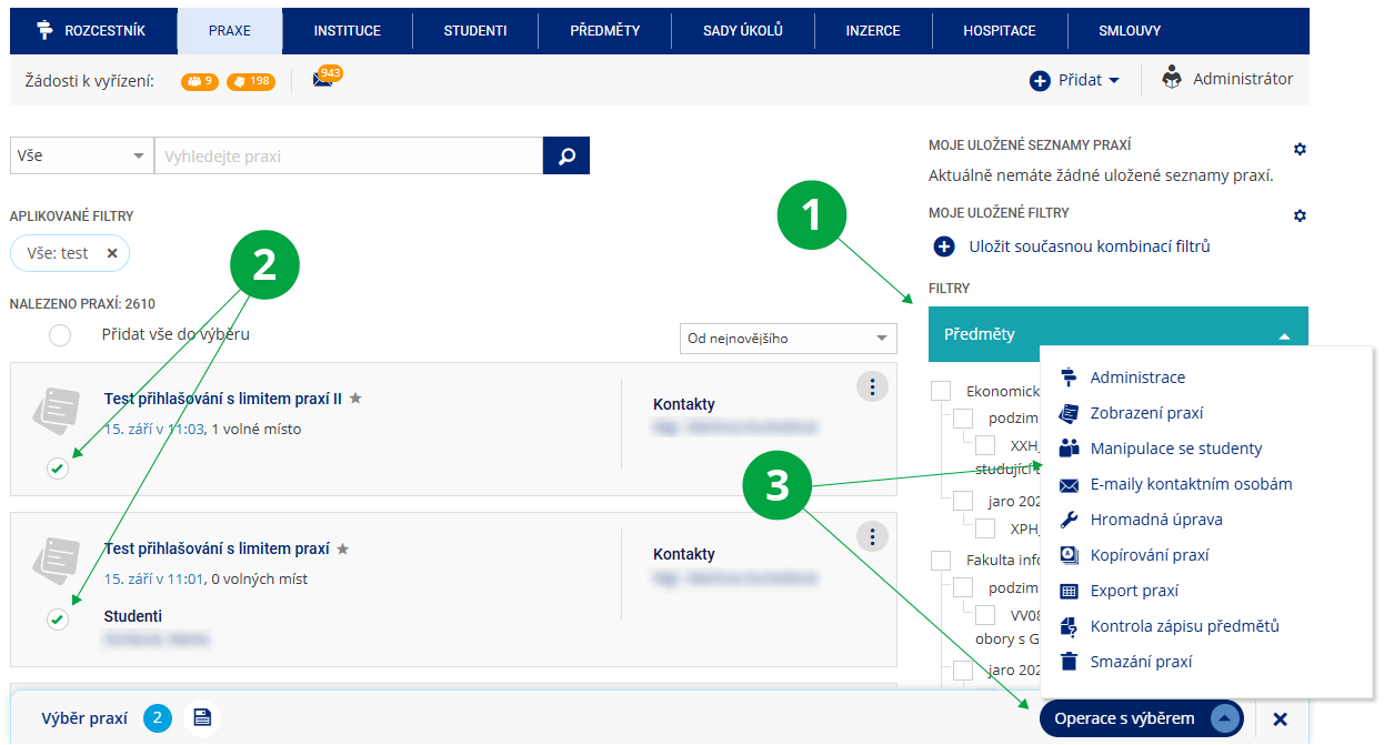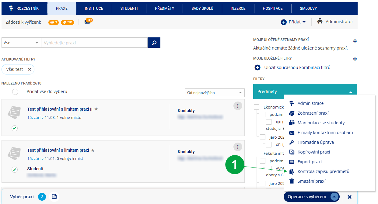 Administrátor vyhledá praxe a označením kolečka u nabídek je přidá do výběru. V liště s výběrem v dolní části stránky lze potom přes tlačítko "Operace s výběrem" s nabídkami hromadně pracovat a za pomoci operace „Kontrola zápisu předmětů“ u těchto nabídek zkontrolat, že studenti mají zapsaný předmět, v rámci kterého praxi absolvují.