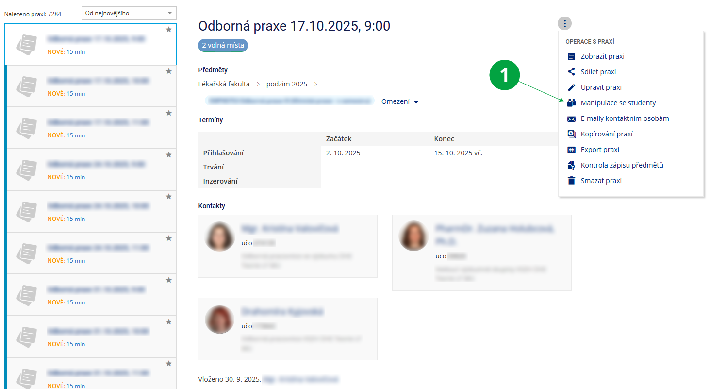 Přes menu tři tečky a následně „Manipulace se studenty“ je možné studenta ručně přihlásit i již přihlášeného studenta odhlásit.