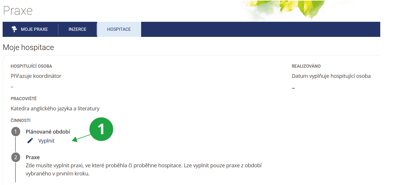 1 Hospitace před vyplněním (student musí vyplnit plánované období a praxi).