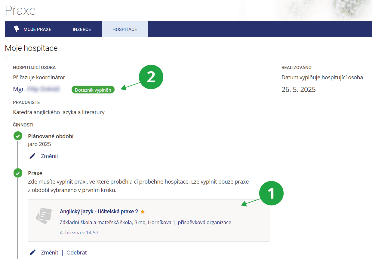 Jestliže je student na praxi hospitován, musí zde vyplnit plánované období hospitace a praxi, ve které proběhla či proběhne hospitace. Hospitující osobu studentovi přiřadí koordinátor z katedry. Datum realizace vyplňuje hospitující osoba.