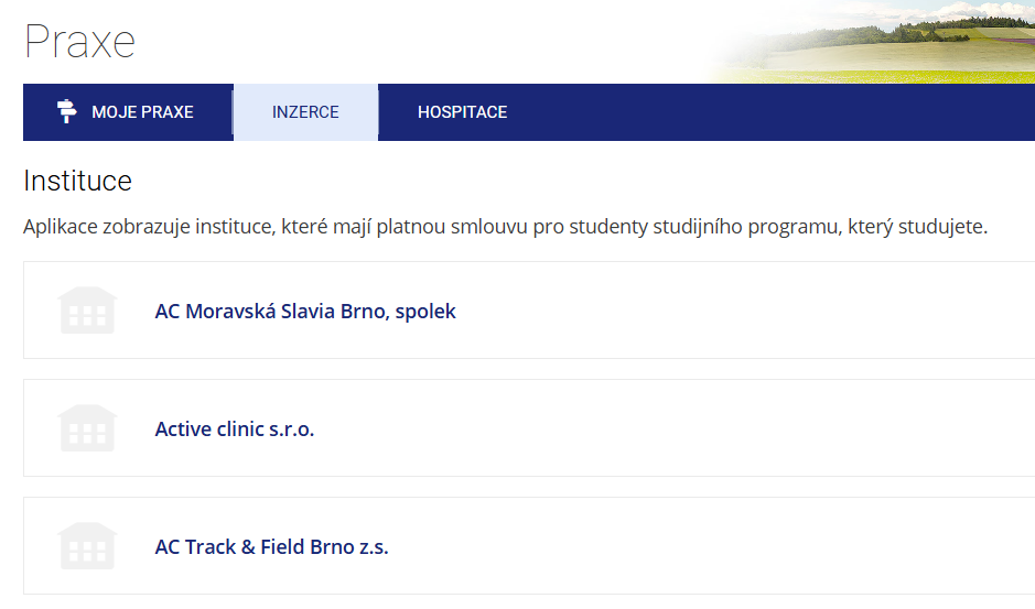 U některých oborů se v aplikaci Praxe evidují i existence smlouvy. To umožňuje poskytnout studentovi seznam institucí, se kterou je na jeho studovaný program uzavřená smlouva, přes: