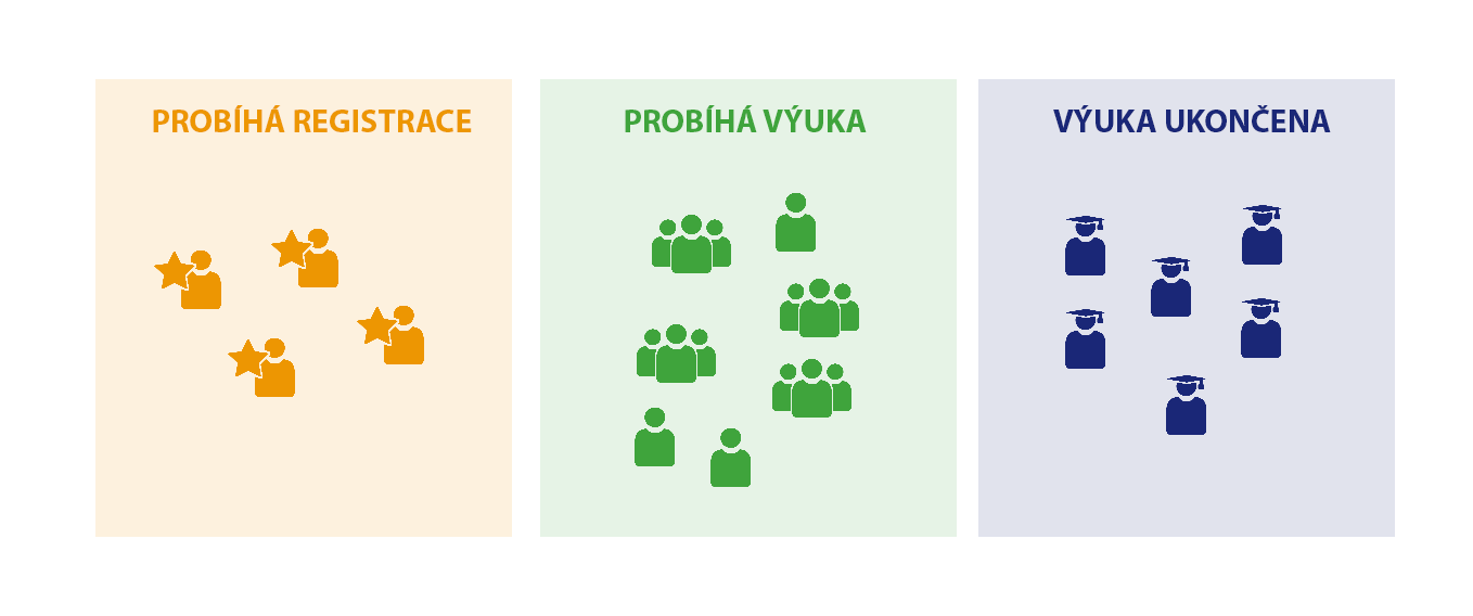 - „probíhá registrace“ (aktivní zaregistrovaní a aktivní zapsaní studenti), doba registrace,