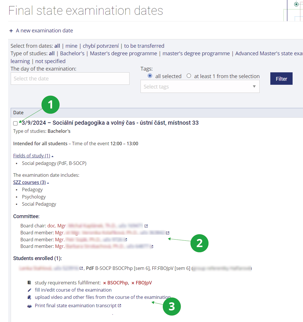The course is recorded in the “Final State Examination Dates” application. In this application, the chair of the examination board, members of the examination board and the board assistant will find a link to fill in the course of the final examination. The course can be pre-filled and saved in advance, even before the date of the examination, but it is not possible to request confirmation from members of examination board at that stage. On the day of the examination, a button will become available to request the examination board’s confirmation of the course (and the grade). It is necessary to complete the course in its final form and have it confirmed by all members of the examination board.
